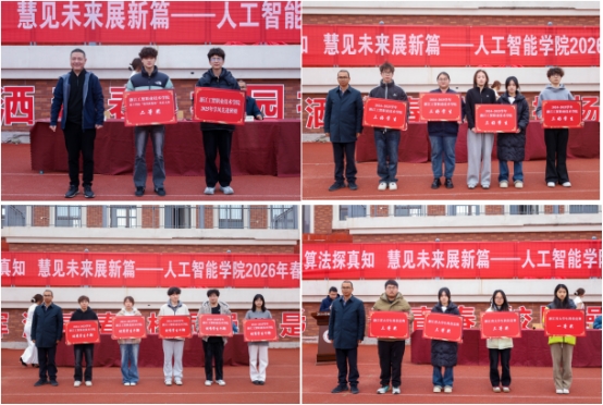 第三项议程:颁奖仪式。洪长存副书记宣读2025年度在各类专业竞赛、学业发展、班级建设、宿舍管理中表现突出的集体和个人获奖名单,并对获奖代表予以表彰。现场依次表彰了:浙江省大学生科技竞赛获奖代表、2025年度三好学生代表、优秀学生干部代表、先进班级代表、五星级文明寝室代表。获奖代表们登台领奖,现场掌声阵阵,这份荣誉不仅是对获奖者努力的肯定,更为全体学子树立了学习榜样,激发了同学们争先创优、奋勇拼搏的学习热情。