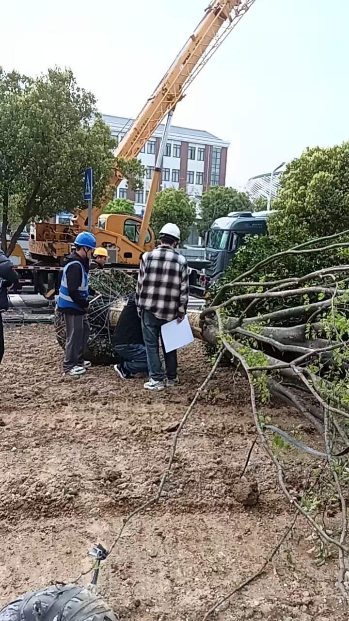 眼下绿意正萌动、春色已渐浓,正是苗木进场的最佳时机。为了更好保护树木、呈现最佳观赏效果,采用全冠移植的树木迎来了“绿色迁徙”,正式落地实训楼标段。工作人员严格按照标准化流程操作:吊运、入坑、临时支撑、覆土、浇灌……每一道工序都精准把控。从苗木定位到角度调整,从避开地下管网到优化整体布局,展现出树木最美的一面,让树木和建筑景观融为一体,注入鲜活灵动的自然底色。
