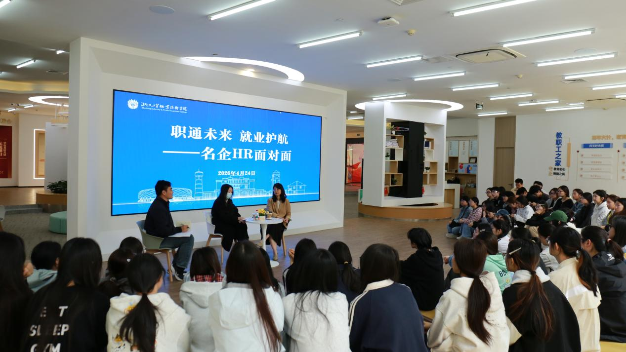 为助力学子提升就业竞争力、精准对接企业用人需求,4月24日上午,浙江工贸职业技术学院在瓯江口校区党群服务中心顺利开展“职通未来就业护航——名企 HR 面对面”活动。本次活动由学校招生就业办主办,特邀浙江森马服饰股份有限公司人事经理潘炜、浙江吉电控股有限公司人事部经理艾芠莅临现场,与同学们深度交流求职技巧与职场经验,为学子就业之路答疑解惑,现场气氛热烈、互动频繁。