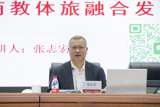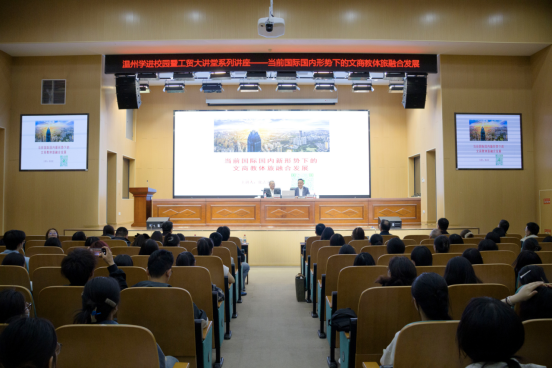 讲座中,张志宏结合自身工作实践,解读国家关于文商教体旅融合发展的政策导向,详细介绍了温州着力打造的“六个温州”特色品牌——温州景、温州味、温州戏、温州夜、温州礼、温州情,展现温州得天独厚的山水文旅资源、深厚的历史文化底蕴、蓬勃的夜经济活力与崇文重商、重情重义的城市精神。并结合温州实际,以温州文旅、体育赛事、演艺经济等鲜活案例,深入浅出地为在场师生展示了文化、商业、教育、体育、旅游相互赋能、融合发展的现实路径与广阔前景。