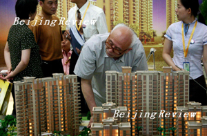 目前在中国,穷人无法买上房子。江苏南京的一个房地产商品博览会上,一位老人在看楼盘模型。(董金林)