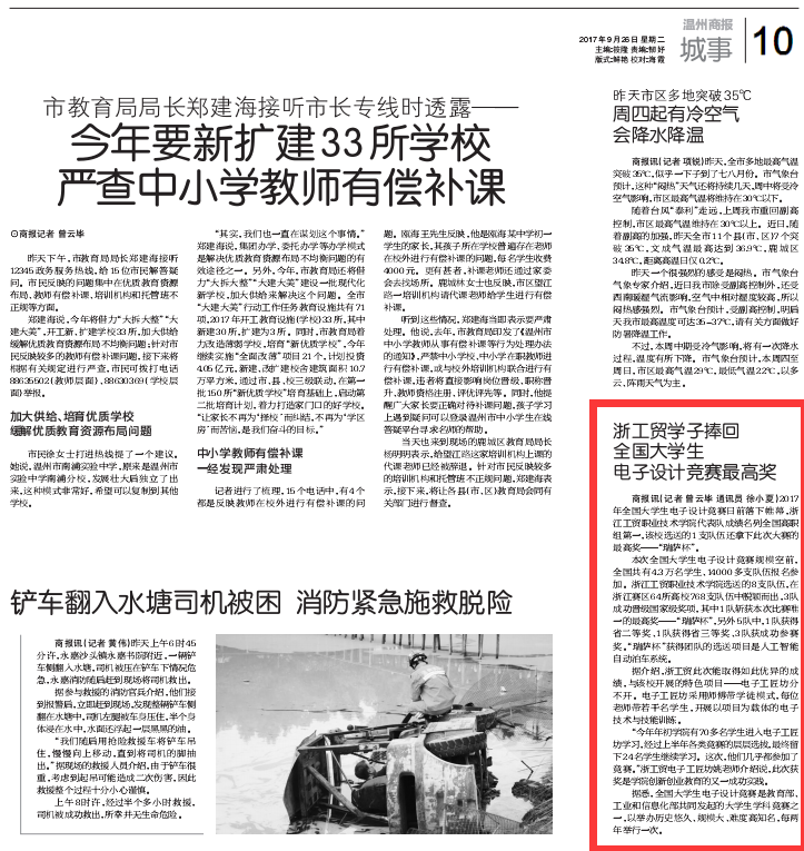 “今年年初学院有70多名学生进入电子工匠坊学习,经过上半年各类竞赛的层层选拔,最终留下24名学生继续学习。这次,他们几乎都参加了竞赛。”浙工贸电子工匠坊姚老师介绍说,此次获奖是学院创新创业教育的又一成功实践。