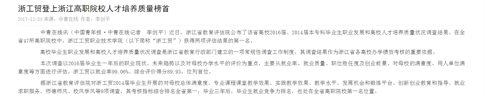据浙江省教育评估院对浙工贸2014届毕业生开展的对母校总体满意度、专业课程课堂教学效果、实践教学效果、教学水平、发展机会和锻炼平台、创新创业教育和指导、就业求职服务、师德师风、校风学风等9项调查,其考核指标综合排名全省第一;毕业三年后,毕业生就业竞争力排名,也处在全省高职院校第一名位置。