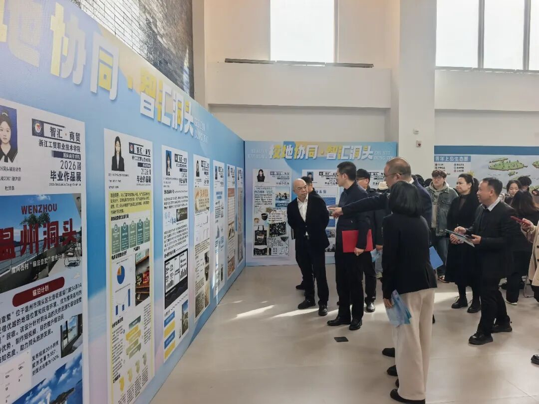 展厅里,从温州非遗贝雕文化的短视频科普,到杨梅供应链的数智化转型方案;从跨境电商的市场分析,到本土企业的电商实践报告,每一件作品都凝结着学生们在海岛走访、调研、思考的痕迹。