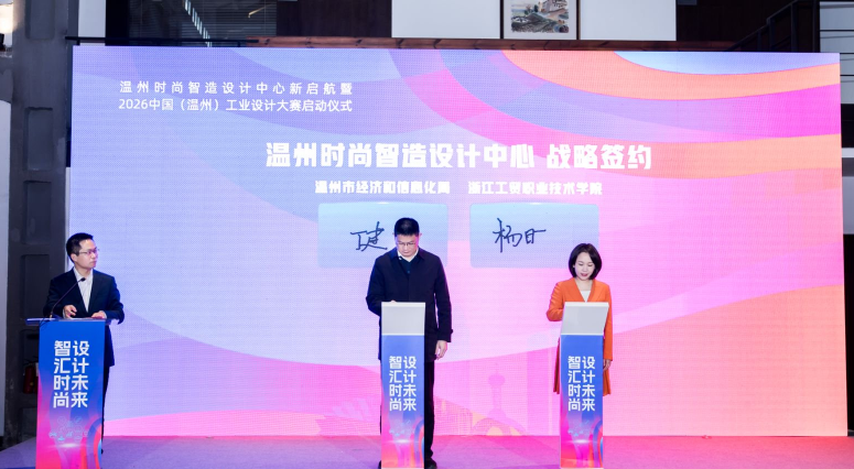 1月6日,温州时尚智造设计中心新启航暨2026中国(温州)工业设计大赛启动仪式在浙江工贸职业技术学院(以下简称浙工贸)浙江创意园举行。集聚工业设计资源,打造集设计赛事、成果转化、知识产权保护、设计共性研究、产业对接、人才引育等于一体的工业设计服务“生态链”,持续打响“设计温州”品牌。