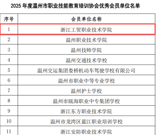 近日,温州市职业技能教育培训协会正式发布2025年度优秀会员单位评选结果,浙江工贸职业技术学院凭借卓越的培训成效、创新的教学模式以及持续的社会贡献,再次获评“优秀会员单位”称号。这是该校自2020年以来连续第六年荣获此项荣誉。