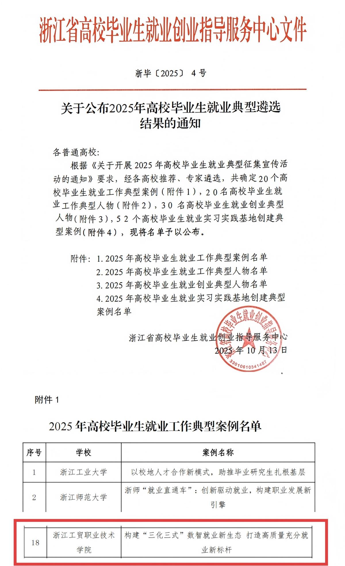 近日,浙江省高校毕业生就业创业指导服务中心公布《2025年高校毕业生就业典型遴选结果》,浙江工贸职业技术学院凭借在数智就业服务与产教融合实习基地建设方面的突出实践,2项案例成功入选——《构建“三化三式”数智就业新生态打造高质量充分就业新标杆》获评“高校毕业生就业工作典型案例”,《物流管理专业中高职一体化现代学徒制实习就业基地》获评“高校毕业生就业实习实践基地创建典型案例”,充分彰显学校在毕业生就业育人领域的特色优势。