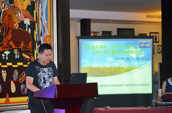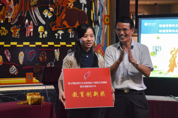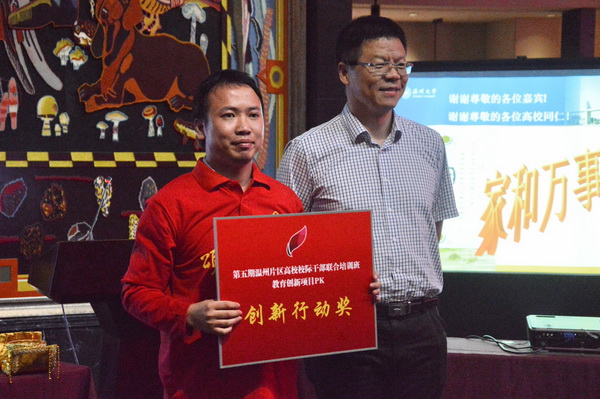 五所高校,六组成员,121位学员,大家纷纷出奇出新,展示各自教育创新项目。我院以《一枝独放不是春,百花齐放春满园——以公益活动为平台培养学生的社会责任感》,以大学生德育为抓手,倡导学生服务社会的慈善理念,通过各类社会志愿实践活动,润物细无声地提高大学生社会责任感。温州科技职业学院结合学院农科特色,提出《实施点、线、面三维创业教育,培养“学农、爱农、兴农”的现代农业创业人才》项目,采取“导师+项目+团队”创新教学方式,协同全方位资源为培养现代农业创业型人才服务。温州大学在师生关系上开拓新渠道,围绕着《学区制教育管理模式下新型师生关系的构建及途径探》进行了阐述。温州职业技术学院在号称“史上最难就业年”的形势下,开展了《“以就业为导向,以专业为依托”校企合作开展大学生暑期专业实践活动》创新研究,提高大学生就业质量。温州医科大学(第二组)以唐玄宗与杨贵妃古装反串角色出场,将PK推向高潮。从他们独特新颖的开场中,引出当下最热门的“微”载体、“云”媒介为创新源,实现学生教育管理工作的精细化改革与高效整合利用相结合。温州医科大学(第一组)以数字化信息为基础,以计算机技术和网络系统为依托,拓展新媒体育人环境,提出《医大在线——数字化校园移动信息应用平台(APP)项目》。各小组成员热情洋溢、思维缜密、妙趣横生的汇报深深吸引着在场所有听众。会场气氛随着时而轻松,时而严肃,时而紧张……经过激烈的PK,最终,温州医科大学(第一组)获得教育创新奖,浙江工贸职业技术学院获得创新行动奖,温州医科大学(第二组)、温州科技职业技术学院、温州职业技术学院、温州大学获得团队协作奖。