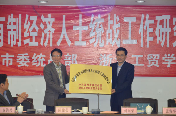与会学者则高度肯定市委统战部将研究中心落地挂牌工贸学院的决策,并就研究中心今后的工作思路提出了诚恳的建议:希望研究中心今后的工作能够常态化、制度化,经常性的举办一些交流、研讨活动;今后的研究方向要和温州市的市情、地方实际结合起来,抓住诸如金改、非公有制企业转型升级等热点问题进行研究;建议建立研究中心人才库,注重后续研究人才的培养,能够形成合理的研究团队等。