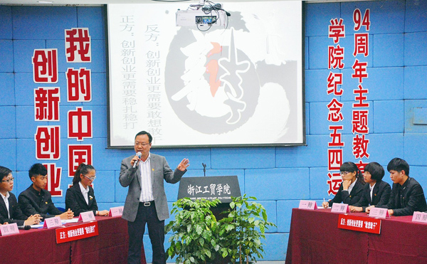 5月3日晚,“创新创业·我的中国梦”学院纪念五四运动94周年主题教育活动在学院阶梯教室举行。我院青年学生围绕“创新创业是‘稳扎稳打’还是‘敢想敢干’”展开激烈的辩论。学院党委书记何向荣教授、温州市委宣传部副部长戴嘉宝、学院副院长倪建发等出席了此次纪念五四运动94周年主题教育活动。