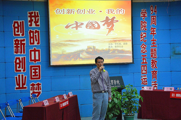 何书记结合五四运动94周年指出,年龄是有限的,青春是无限的,学院建校以来一代代工贸人传承了五四精神的青春朝气与活力,要创新创业实现“我们的中国梦”需要青春的朝气与活力支撑。创新创业都基于朴素的劳动,只有辛勤劳动才能创造财富,只有诚信劳动才能创造幸福,我们只有创造性地劳动才有美好的未来。学院的三大园区、科研中心、工学结合是我们的创新项目基础,大学生如何进一步发挥我们的创新优势,有我们的专业、科研、课题、文化方面的优势,创新创业是我们学院的特色校园文化,将有助于青年学生的创新创业。创业不仅是一个同学通过组建团队,项目运营而盈利,应是在工学结合、学习生活、职业发展中灌输创新的意识和创业的精神,每一家企业、每一个岗位都需要弘扬创业精神。何书记寄语我院青年学子要基于创新创业的精神进行更好地学习,以有利于将来在社会上职业更好的发展。