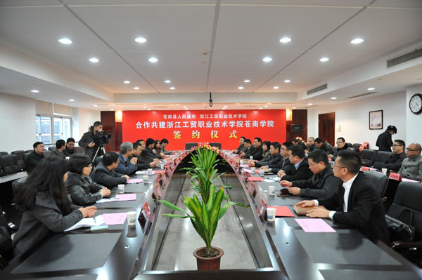1月14日下午,我院与苍南县合作共建浙江工贸职业技术学院苍南学院签约仪式在苍南县人民政府举行。市教育局局长谢树华,苍南县党委书记黄寿龙,县长董庆华,浙江工贸职业技术学院院长贺星岳,副院长张俊平,副院长倪建发及我院相关职能部门负责人等参加了签字仪式。签约仪式由谢树华局长主持。