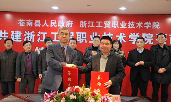 为更好地服务苍南县产业转型升级,创新办学体制和运行体制,苍南县县长董庆华和学院院长贺星岳代表双方签订合作办学协议。浙江工贸职业技术学院苍南学院属学院二级学院,以全日制学历教育为主,学制三年。同时开展成人教育、短期培训、技术研发等项目,建成融教学、培训、研发为一体的现代化职业院校。学院选址在龙港新城,规划用地面积1070亩,一次性规划,分三期建设到位。一期占地面积273亩,2013年启动建设工作;二期和三期占地面积分别为370亩和427亩。苍南学院将依托学院的优质学科为办学基础,面向苍南县经济支柱产业开设国际经济与管理、国际贸易实务、市场营销、包装技术与设计、印刷技术、物流管理、学前教育、电子技术应用、酒店与旅游管理、现代农业等专业。