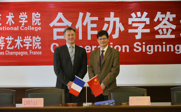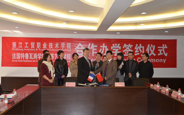继与英国华索学院签订了合作办学项目的协议,进行“2+1”专科课程及“3+1”硕士预科课程的合作以后,3月12日早上,学院与法国特鲁瓦商学院在温举行“3+1+2”合作办学本科、硕士留学项目签约仪式。学院党委委员、副院长张俊平、法国特鲁瓦商学院副校长Jean-Louis CHAPERON先生,特鲁瓦商学院中国招生代表冯凌燕女士,学院相关部门,学生代表出席签约仪式。法国是传统接受中国留学生的国家,而且在法国的温州商人也特别多。浙工贸学生完成在温学习任务以外,学院更是为他们开辟了前往欧洲继续深造的新航线,该项目为在温高校中法合作办学的历史上增彩一抹重彩。