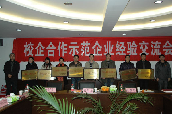 副院长张俊平首先致辞欢迎,向各位企业代表介绍了学院的基本情况和我院的“校企合作、工学结合人才培养”模式及校企一体的办学特色;校企合作办主任台新民结合我院28个专业的特色,介绍了目前校企合作的四大主要类型及具体合作形式;杭钢集团、浙江九龙国际物流有限公司、永嘉县泵阀科技创新服务中心、浙江思珀整合传播有限公司、申瓯通信设备有限公司等5家企业作为示范企业的代表进行发言,对企业的基本情况、校企合作方式、人才培养模式、取得社会效应等方面进行了经验介绍;在自由讨论的环节,参会的企业代表各抒己见,互相交流经验;院长贺星岳、副院长张俊平为首届校企合作示范企业授牌。