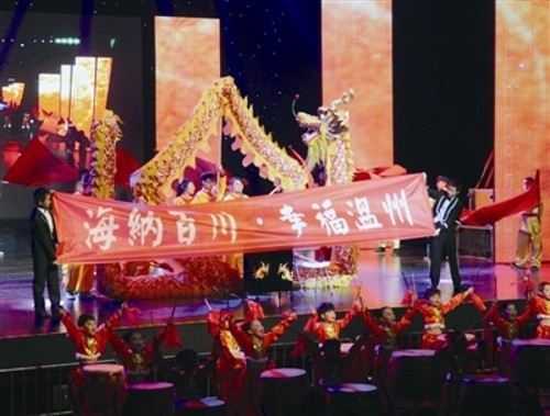 温州的建设发展离不开400万新温州人的辛勤与汗水。据悉,这是我市首次举办以新居民为主的春节联欢晚会。晚会节目共分“梦在温州、家在温州、美丽温州”等三个篇章,每个篇章都由新居民原创谱写篇章主题曲,演出节目15个,演职人员多达300余人,形式多样有舞蹈、歌曲、小品、戏曲选段、快板、相声,全部由新居民演员出演。我院大学生艺术团积极参与新居民春节联欢晚会,承办了晚会开场舞龙和压轴歌曲表演,我院的大学生艺术文化也走上了温州大剧院的艺术舞台,受到了现场观众的欢迎与好评。