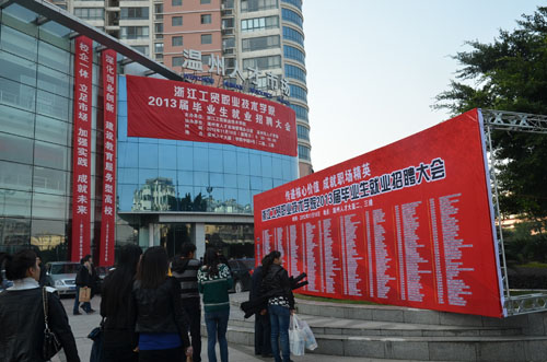 本次招聘会共吸引杭州钢铁集团公司、奥康集团、报喜鸟集团、康奈集团、巨一集团、红蜻蜓、绿城集团、中梁地产集团、万和豪生大酒店、华侨饭店、国际大酒店、泰昌集团、九龙国际物流、凤凰科技有限公司、温州市公共事业投资集团等省内外368多家知名企业前来参会。共提供需求岗位11000多个,毕业生与就业岗位比达到1:4。参会企业涉及市场营销、经营管理、广告、技工、人事行政、财务、计算机、文职人员、设计、机电、模具、电子信息等专业门类,招聘范围涵盖我院所有专业,达成就业意向1000人左右。以文成商会为代表的商会组织企业“抱团”来学院觅人才,成为本次招聘会的亮点。与往年相比,今年外地招聘企业数量明显增加。在经济不景气的大环境下,我院就业招聘会却逆势飘红,实现了“质”与“量”新的跨越,彰显了我院优质的人才培养质量。