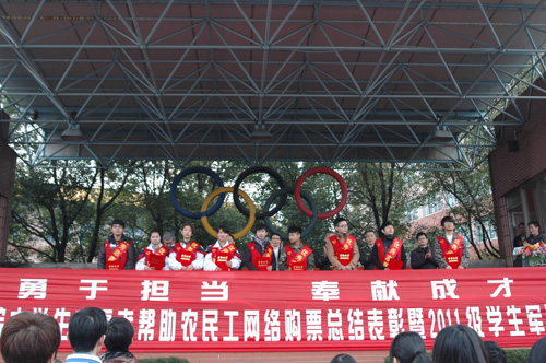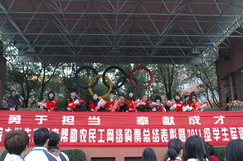 副书记、副院长盖庆武宣读了《关于表彰2012春运帮助农民工网络购票“杰出志愿者”、“优秀志愿者”的决定》,对鲍丹双、林元瑞等8名杰出志愿者和陈凡迪、项杨义等9名优秀志愿者进行了表彰。3位杰出志愿者代表上台发言,他们表示经历过志愿者活动他们了解了其中的艰辛;经历过志愿者活动他们了解了其中的快乐,经历过志愿者活动他们深刻体会了大学生的能量、使命和社会责任。奉献和坚持让他们更加满足,将对他们追求人生价值和目标有着积极影响。温州日报记者王莉莉也谈了她的感受,与志愿者几天的相处,她深深爱上了这些默默奉献、纯粹无私的志愿者,让她感受到了工贸学院服务社会的理念。