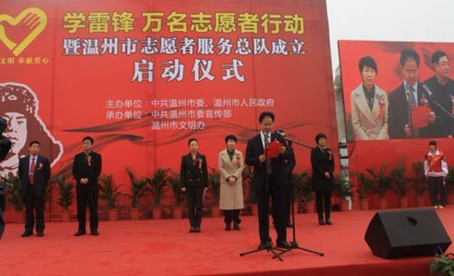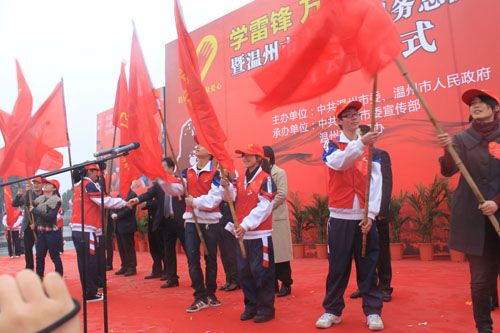 为弘扬和传承雷锋精神,深入传播志愿服务理念,3月4日上午,由温州市委、温州市人民政府主办,中共温州市委宣传部、温州市文明办承办的“学雷锋万名志愿者行动”暨温州市志愿服务者总队成立启动仪式在温州世纪广场隆重举行。市领导王昌荣、胡剑谨、卓高柱、郑朝阳、潘长旺等出席了仪式,并为包括我院“红马甲”、“弘恩行”、“绿丝带”、“啄木鸟”、“蒲公英”5支青年志愿者服务队伍在内的全市68支志愿服务队授旗。