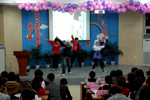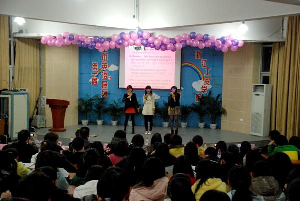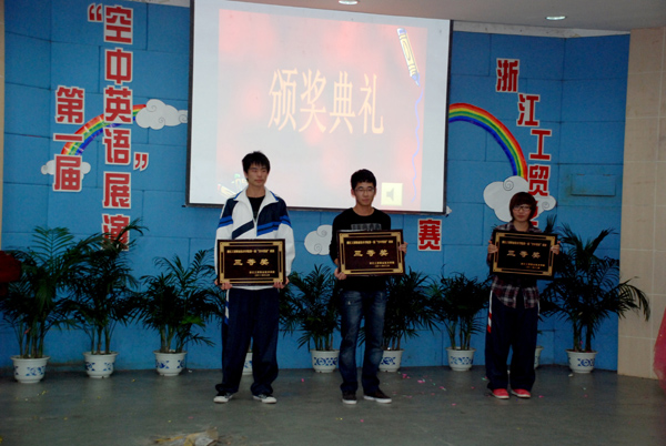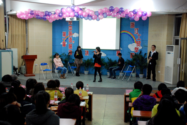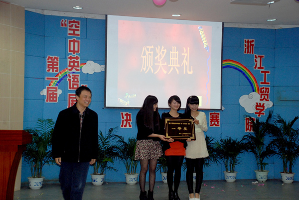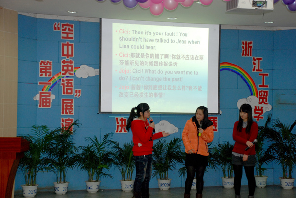 12月5日晚,我院第一届大学生“空中英语”展演活动决赛在学院阶梯大教室举行,活动由人文系、学生处及团委联合主办,学生社团联合会承办,英语俱乐部及人文系法语专业学生会协办。来自我院各分院系及学生社团的11支代表队在决赛的舞台上激情飞扬、才华四溢,上演了一场丰盛的视听盛宴。同学们在舞台上语言流畅、表演大胆、配合默契、创意新颖,充分展现了工贸学子积极向上的英语学习热情以及“空中英语教室”网络学习平台的非凡魅力,引得台下评委及师生观众们的连连叫好。
