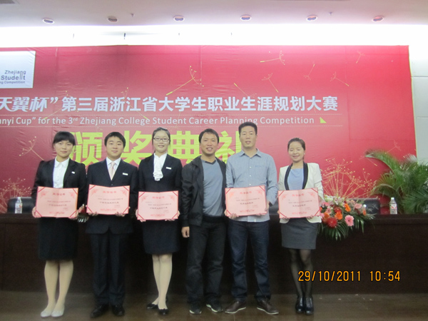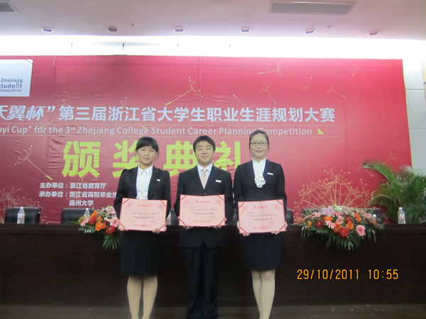 2011年10月29日,由浙江省教育厅主办的“第三届浙江省大学生职业生涯规划大赛”圆满结束,本届大赛以“规划人生、放飞梦想”为主题,旨在普及大学生规划知识,提升职业能力,打造优质人生,拓展我省大学生就业创业工作。我院共有三名选手进入总决赛,最终三位同学在此次大赛中全部胜出,夺得“浙江省十佳职业规划之星”和“浙江省十佳创业规划之星”荣誉称号,我院也成为在全省高校内摘得规划之星最多的院校。