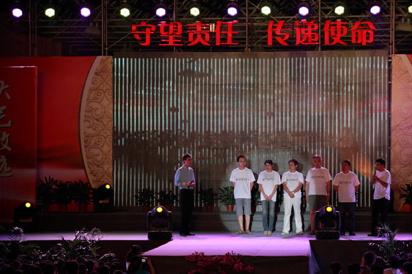 晚会上,学院还邀请了“7.23”动车事故的现场救援代表、志愿者代表、事故发生地附近的村民代表和我院参与伤员心理危机干预的老师、学生志愿者代表。通过回顾动车救援事件,重温了温州人的大爱精神。一曲歌伴舞《让世界充满爱》引起了全场师生的共鸣,爱、奉献、责任的气氛让现场倍加温暖。晚会还举行了“第二届我最喜爱的十大老师”颁奖仪式。经过严格周密、公正公开的投票,施杏姑、王淑铃等十位老师获选;老师们的辛勤工作离不开家属的支持和付出,十位老师的家属们亲自上台为获选老师颁发证书、并共同举起奖杯。学院2011级新生家长代表、校友代表、知名企业家代表等在典礼上分享自己在大学学习、生活中的经验,指导他们更快地适应大学校园生活。最后学院领导和“我最喜爱的十大老师”为新生代表佩戴了校徽。