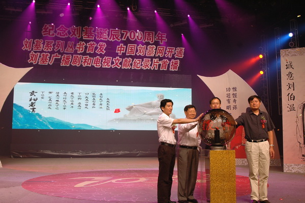 7月13日起,纪念刘基诞辰700周年系列活动隆重启动。本次系列活动由中国明史学会、温州市委、市政府主办,温州市委宣传部、温州市文化广播电视新闻出版局、浙江工贸职业技术学院及文成县委县府联合承办。当天,在温州电视广播中心举行了刘基文献电视纪录片首播仪式暨中国刘基网开通、刘伯温广播剧首播、刘伯温系列丛书首发仪式。
