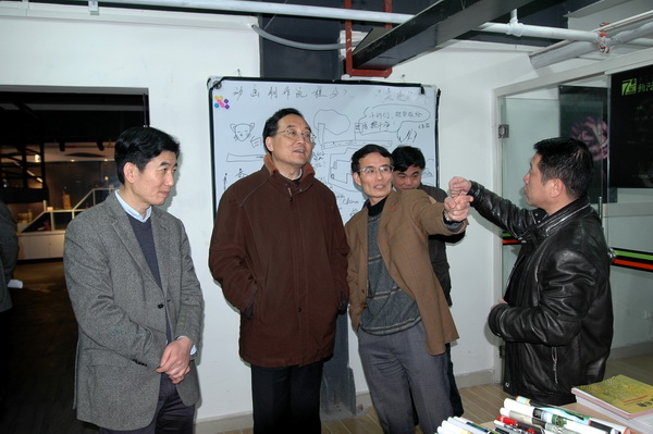 3月6日下午,浙江省文化厅厅长杨建新等一行,在温州市副市长仇杨均及温州市有关部门领导的等随同下,视察了我院与温州报业集团联合建设的浙江创意园。在我院院长何向荣、副院长盖庆武等陪同介绍下,杨厅长一行分别考察了园区内的主要入驻单位、我院设在园区的传统工艺美术研究所、工业设计工作室、动漫设计工作室、温州名购网、旅游文化策划工作室等产学研基地,并听取了我院关于发展创意产业服务推动当地经济转型的相关工作。杨建新厅长高度评价了我院积极服务社会,打造公共服务平台的做法与特色。