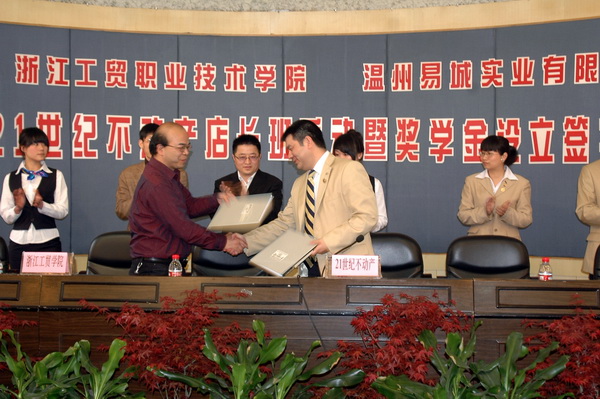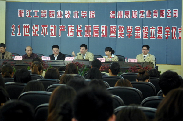 根据双方达成的协议,我院经济与贸易学院与21世纪不动产温州区域联合将联合开办店长班。市场营销类专业(含房地产经营与管理方向)的学生经本人报名且面试合格后,成为“21世纪不动产店长班”学员。该班学员在校就读期间就可以享受参加21世纪不动产与市场营销专业联合制定的专业课程学习、顶岗实习、毕业综合实践等教学环节学习,修业合格后,可直接到该公司就业。同时,21世纪不动产温州区域连续三年每年出资5万元,设立“浙江工贸职业技术学