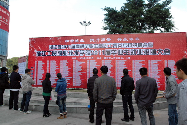 12月5日,浙江省2011届高校毕业生就业高职工贸类专场招聘暨浙江工贸职业技术学院2011届毕业生招聘会在温州市人才大厦人才市场成功举行。此次招聘会由浙江省教育厅主办,浙江工贸职业技术学院承办,温州市人才开发服务中心协办。此次招聘会吸引了来自省内外近450家用人单位,涵盖了市场营销、经营管理、广告、技工、人事行政、财务、计算机、文职人员、设计、机电、模具、电子信息等专业门类,既有一些国有大型企业(集团),也有许多处于成长中的中小企业。招聘会为大学生提供了将近13000多个岗位,岗位涉及面广、数量多,给广大求职学生提供了广阔的择业空间。