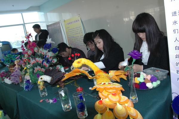 创业园的创业大学生展示自己设计制作的工艺美术产品