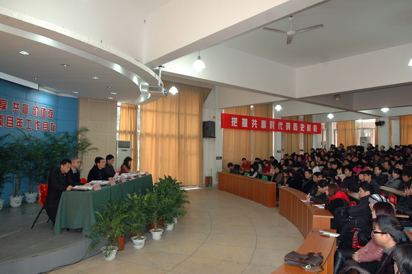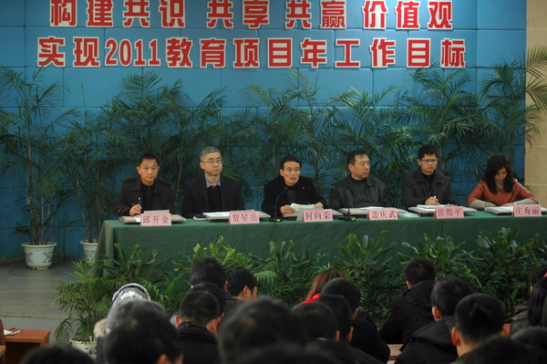 辞旧迎新,在新春佳节结束之际,我院于2011年2月15日上午召开2011年新学期全体教职工大会。会议由院党委副书记、副院长盖庆武主持。院党委书记、院长何向荣作《构建共识、共享、共赢价值观,实现2011教育项目年工作目标》的重要讲话,分别从2010年工作回顾、确立“大发展观”、“大工贸观”、“大幸福观”、以及学院2011年工作目标等几个方面进行了阐述,并强调计划重在落实。