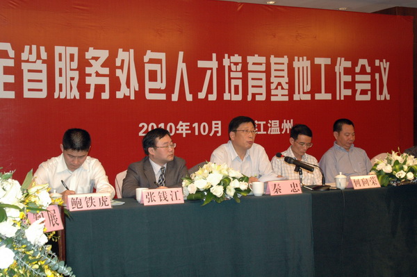 省商务厅党组成员、纪检组长秦忠在会上指出,这次重要会议,是为了更好地贯彻落实国务院和省委、省政府关于发展服务外包的一系列政策文件精神,进一步加大服务外包人才培育基地建设,为我省服务外包产业发展提供有力的人才保障而举行的。大力发展服务外包有利于加快推进经济转型升级、有利于有效解决社会就业问题、有利于加快调整国民收入分配格局、有利于加快转变商务发展方式。秦忠通报了浙江省今年以来服务外包发展及人才培育基地建设情况。同时,他指出,我省服务外包产业已进入一个重要的发展时期,工作任务还很重。为此他认为:一是要以服务外包“十二五”发展规划指导全省工作。认真按照规划要求,加强对人才培育基地(培训机构)、各示范园区工作的指导。各高校人才培育基地和培训机构要在“十二五”规划总框架下制定各自人才发展规划,不断提高人才培养质量和水平。二是要培育一批服务外包重点企业。以软件开发、金融、物流、人力资源等具有比较优势的服务外包领域为重点,扶持一批服务外包重点企业,三是要形成服务外包人才培训合力。形成政府、企业、高校(培训机构)三方联合推动人才培养的良好格局,打造一批优质、高效的服务外包人才培育基地和培训机构。