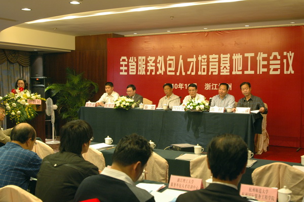省商务厅、教育厅、市外经贸局和教育局等部门领导为18家省级服务外包人才培育基地授牌。杭州师范大学国际服务工程学院、宁波服务外包学院(宁波职业技术学院)、金华市职业技术学院、浙江工业大学计算机学院等4家院校作了“服务外包人才培育”典型性发言。针对服务外包人才培养的校企合作和课程开发,与会代表就如何充分利用自身的资源和优势,积极开展服务外包人才培训,鼓励和引导更多的大中专毕业生到服务外包产业去就业和创业进行了热烈的讨论和交流。