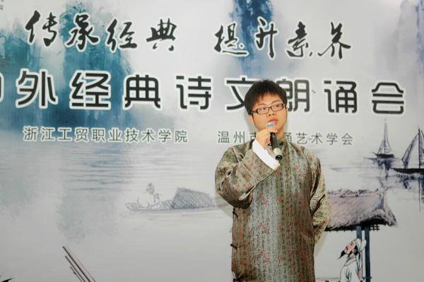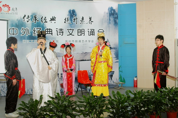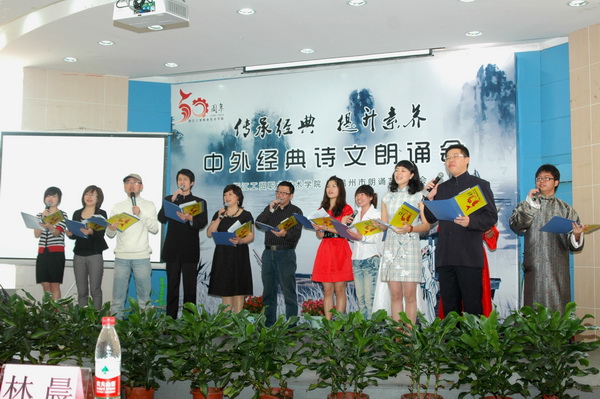 在随后进行的经典诗文朗诵会中,温州市朗诵艺术会的朗诵名家与我院学生朗诵爱好者纷纷登台表演了《青春中国》、《祖国颂》、《祖国啊,我亲爱的祖国》、《相信未来》、《雨巷》、《琵琶行》《黄河颂》等众多古今经典诗文及为校庆原创的《在这片希望的土地上》等朗诵节目,受到了与会师生的热烈欢迎,全场激情高涨,气氛活跃。