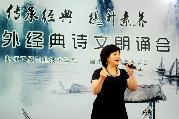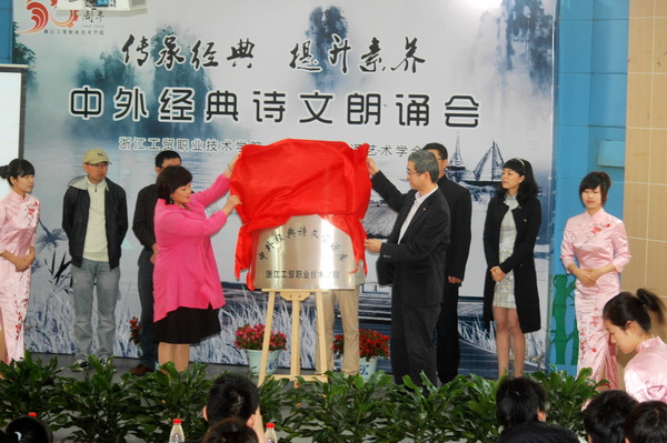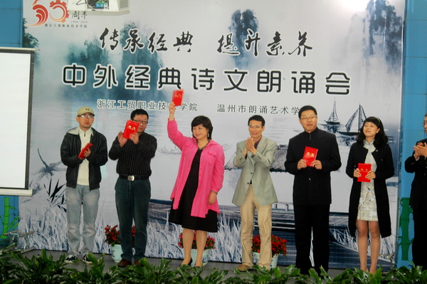 党委书记、院长何向荣与温州市朗诵艺术会会长王丽在活动前先后致辞。党委委员、副院长贺星岳与市朗诵艺术学会负责人为设在我院的“中外经典诗文资料库”揭牌;何向荣院长宣布聘请参与活动的市朗诵艺术学会的朗诵家为学院学生素质拓展培训师并颁发聘书。学生处处长王春柳宣读了在学院倡导开展传承经典 提升素养活动的倡议书。