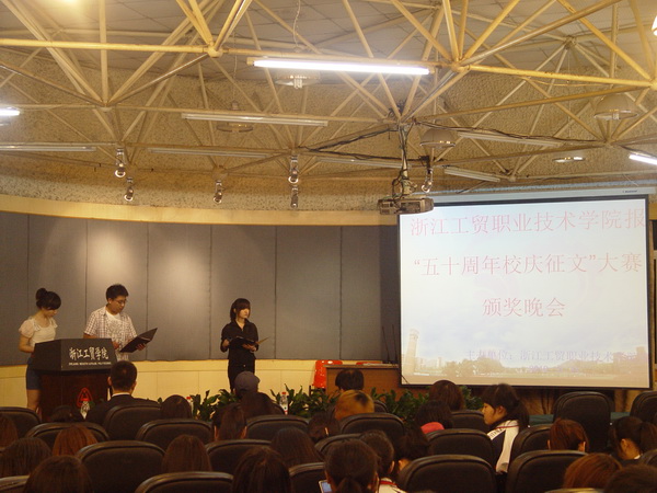 近日,浙江工贸职业技术学院校庆征文比赛颁奖晚会在我院多功能厅举行。本次晚会由浙江工贸职业技术学院报编辑部主办,党院办黄专途、徐辉、王振栋,校庆办张宏明等老师参加颁奖,各参赛作者和我院各系学生参加了本次晚会。