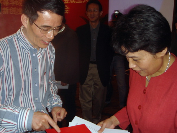 会间,林蕙青部长助理欣然接受了何院长赠送的介绍我院创业创新教育文本材料