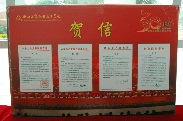 本次校庆礼品展展出了国家教育部、中共浙江省委、浙江省人民政府、国务院参事室发来的贺信、辽宁阜新市人民政府赠送的玛瑙工艺品《大展宏图》、南京大学赠送的骨石镶嵌画《朝阳》陕西科技大学赠送的《地球仪》、台湾高苑科技大学赠送的水晶雕塑《百年树人》、上海第二工业大学赠送的水晶工艺品《纪念碑》、《芜湖机电学院赠送的雕塑工艺品《迎客松》、天津中德职业技术学院赠送的美术工艺品《鼻烟壶》、云南西双版纳职业技术学院赠送的十字绣品《云南印象》、上海电机学院赠送的水晶工艺品《友谊》、四川国际标榜职业学院赠送的《陶瓷花瓶》、《新疆昌吉职业技术学院赠送的《艺术挂毯》、宁夏职业技术学院赠送的大型玉石雕《贺兰砚》、青海畜牧兽医职业技术学院赠送的雕塑《藏羚羊》、温州著名书画家联合创作赠送的作品《满庭芳》等书画作品、胡丕强、江艳芳等校友赠送的《虎啸山河》等等。展会受到了众多师生的关注,参观者络绎不绝。有的被这些物品吸引,凝神注视;有的聚集在一起讨论,表达自己对展览品的看法。