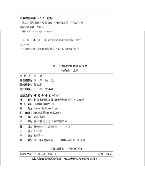 《浙江工贸职业技术学院校史》,在校庆期间由中国和平出版社正式出版发行。