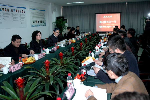 1月21日下午,温州市委书记、市人大常委会主任邵占维一行在来到我院与市科技局联合建设的温州市知识产权服务园及与陕西科技大学联合建设的温州轻工研究院调研考察,并召开座谈会,听取了科技创新相关工作情况汇报。邵占维书记在讲话中对我院的办学模式和质量予以了充分肯定,他认为温州非常需要一大批高素质的技术人才。像工贸学院这样培养的学生能更贴近社会经济发展的需要,市委市政府将加大对职业教育的支持力度。他对我院在提高就业率的同时注重毕业生的就业质量表示赞赏。邵书记在讲话中还肯定了我院的科技创新模式,特别是学院与陕西科技大学合作建立温州轻工研究院这一形式非常好。他表示政府要强化对科技创新的引导,多种途径大力推进研发工作,努力搭建各行业的创新平台。要充分调动科技人员的积极性,结合温州产业发展,制定出符合温州实际的措施,尽可能多地给予支持和引导,在全社会形成重视、鼓励、扶持科技创新的良好氛围。