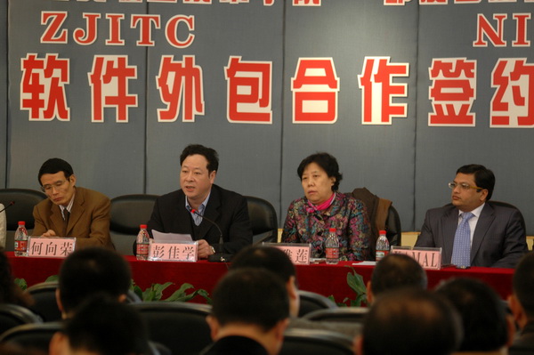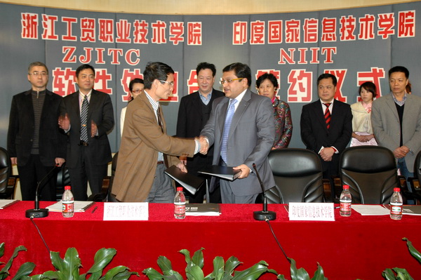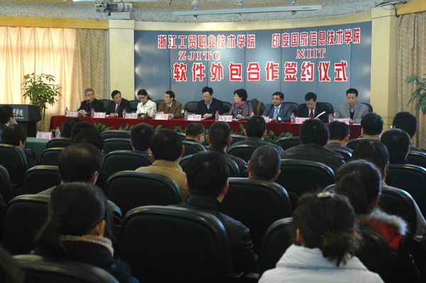 2010年2月23日,我院与印度国家信息技术学院(NIIT)软件外包及合作办学签约仪式在学院多功能厅举行,温州市常务副市长彭佳学、浙江省商务厅副厅长鞠雅莲、印度NIIT中华业务总裁凯姆(KAMAL)、学院院长何向荣等领导嘉宾及工贸学院部分师生代表参加了签约仪式。