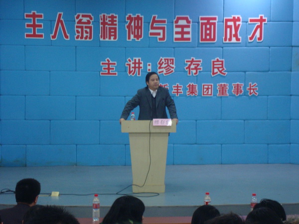 3月5日晚,在我院团委举办主题为“发扬主人翁精神与全面成才”的励志人生报告会上,新丰集团董事长缪存良就个人创业经历和对当代大学生要求与希望做了精彩报告,新丰集团董事、苍南金乡复合材料有限公司总经理陈加福就成立“新丰班”做了关于新丰集团企业文化和发展愿景的宣传动员,最后,校企合作办副主任吴同喜就成立“新丰班”的背景、意义以及大致日程做了说明,本次活动拉开了与新丰集团校企合作项目的合作序幕。“新丰班”的成立和运作将成为我院校企合作、工学结合又一朵即将绽放的奇葩。