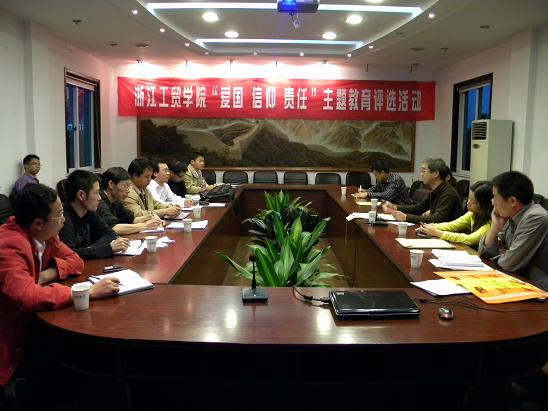 为认真总结我院深入开展的“爱国 信仰 责任”主题教育活动,巩固主题教育活动成果,11月11日,我院举行了“爱国 信仰 责任”主题教育评选活动。活动邀请了学院副院长贺星岳、学生处处长王春柳、高职研究所所长邱开金、党院办副主任黄专途及基础部两课教研室主任孟祥玲担任评委,各系书记、辅导员等共同参与了本次活动。