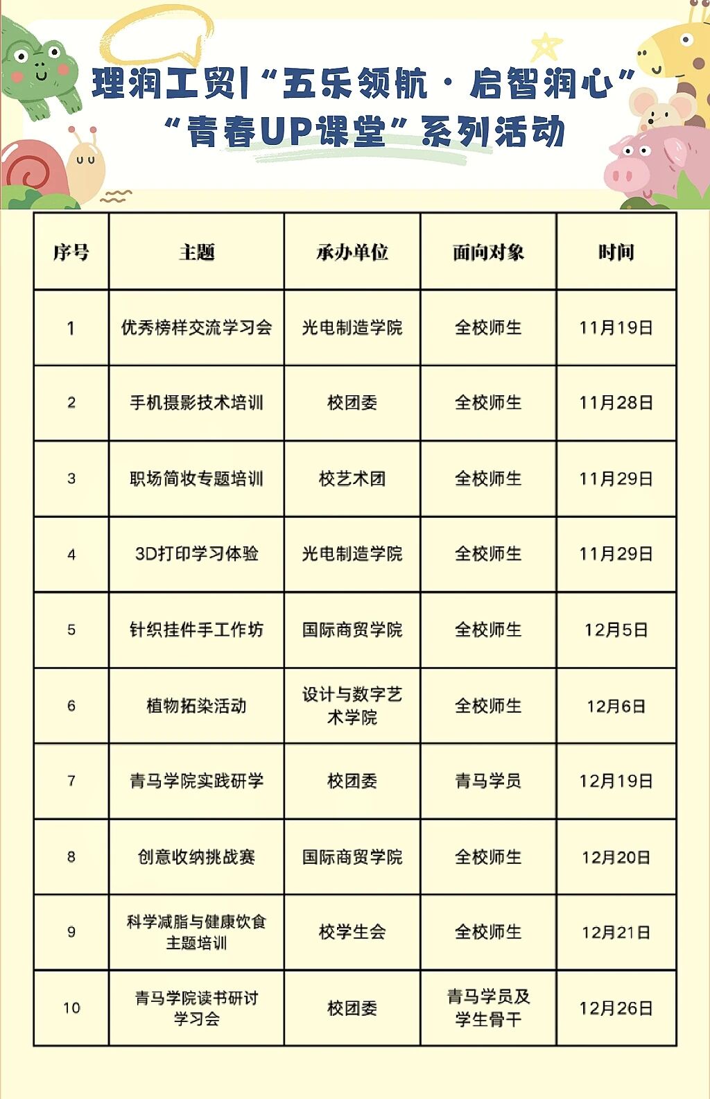 据悉,本次校园文化节系列活动将从11月持续至次年1月,涵盖摄影大赛、音乐夜跑、微电影大赛、器乐大赛、红色故事朗诵等十余项主题活动,以及“青春UP课堂”系列培训活动,内容丰富、形式多样,为学子提供了展示自我、提升素养的广阔平台。