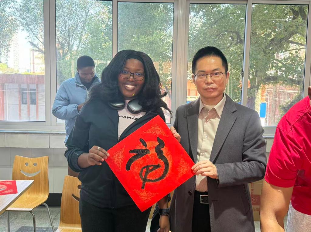书法老师王积建现场指导留学生书写“福”字,让大家在笔墨间感受中国书法魅力,读懂“福”字的吉祥寓意,亲手勾勒出对新年的美好祝福。