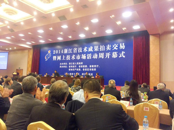 为促进浙江省技术市场的建设与发展,加快形成市场导向,政府推动,企业、高校、院所主动参与的开放型科技合作局面,推动浙江省创新驱动发展战略的实施和创新型省份建设,12月8日,2014浙江省技术成果拍卖交易暨网上技术市场活动周在杭州召开。在开幕式上,有140多项科技成果进行签约,签约总金额超过2.4亿元,备受瞩目的技术成果竞价也在分4个场地同时进行,177个项目将参加竞价(拍卖),起拍价2.83亿元,主要涉及电子信息、新材料、生物技术、机械制造等行业。