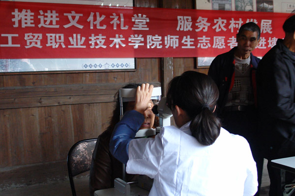 在老年人视觉关爱活动现场,我院眼视光中心师生志愿者们耐心地为各位老年人做眼病筛查、眼底检查、眼压及视力等项目义诊,根据检查情况,详细询问了居民的病情及用药情况,认真做好记录,并根据病症给出合理建议。前来检查和咨询的村民络绎不绝,他们表示,“不用出远门就能享受到像医院一样的优质服务,特别开心”。在现场我们还为远视患者免费赠送了老花镜,整个活动持续两三个半小时,共为150余村民做检查,赠送老花镜115副。