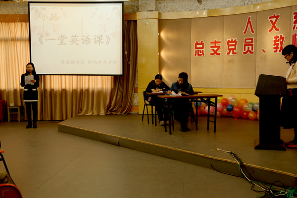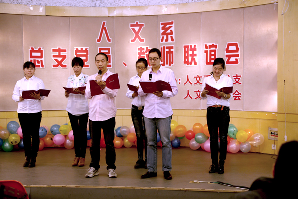 11月14日,人文系党总支在多功能厅举行人文党总支党员、教师联谊会,人文系党总支下属教工、学生、体育发展中心3个支部30余位党员及全体教师、部分学生代表参加活动。人文系5个教研室都排练选送了各自的节目参加。活动寓教于乐、其乐融融,高潮迭起,精彩纷呈:两课思政教研室的党员、老师们表演了自己原创的诗朗诵《我骄傲,我是思政老师》;公共英语教研室的党员、老师表演了自己原创的小品《一堂英语课》; 法语、理科、人文艺术教研室老师分别表演了《我叫伊莲娜》、《油瓶子怕摔》、《我的祖国》等歌曲,学生代表也表演了相声等节目。活动中,还进行了党的知识竞答、集体互动游戏等,受到党员群众的热烈欢迎。