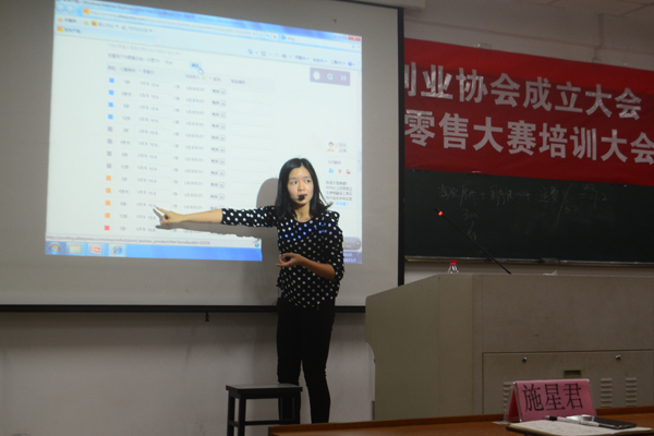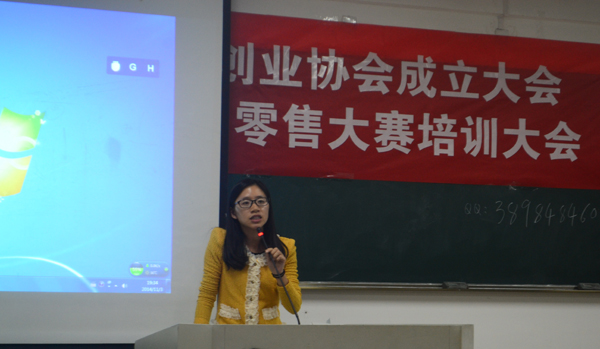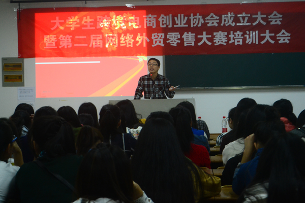 速卖通班班主任叶老师介绍了电商创业的具体流程,并宣布了第二届网络外贸零售大赛的比赛规则。跨境电商创业协会指导老师周老师致祝贺词,并鼓励同学们携手并进,资源共享,勇创奇迹。大会最后,大学生跨境电商创业协会社长吴潇带领全体会员进行宣誓,誓言积极向上,大家情绪高涨。